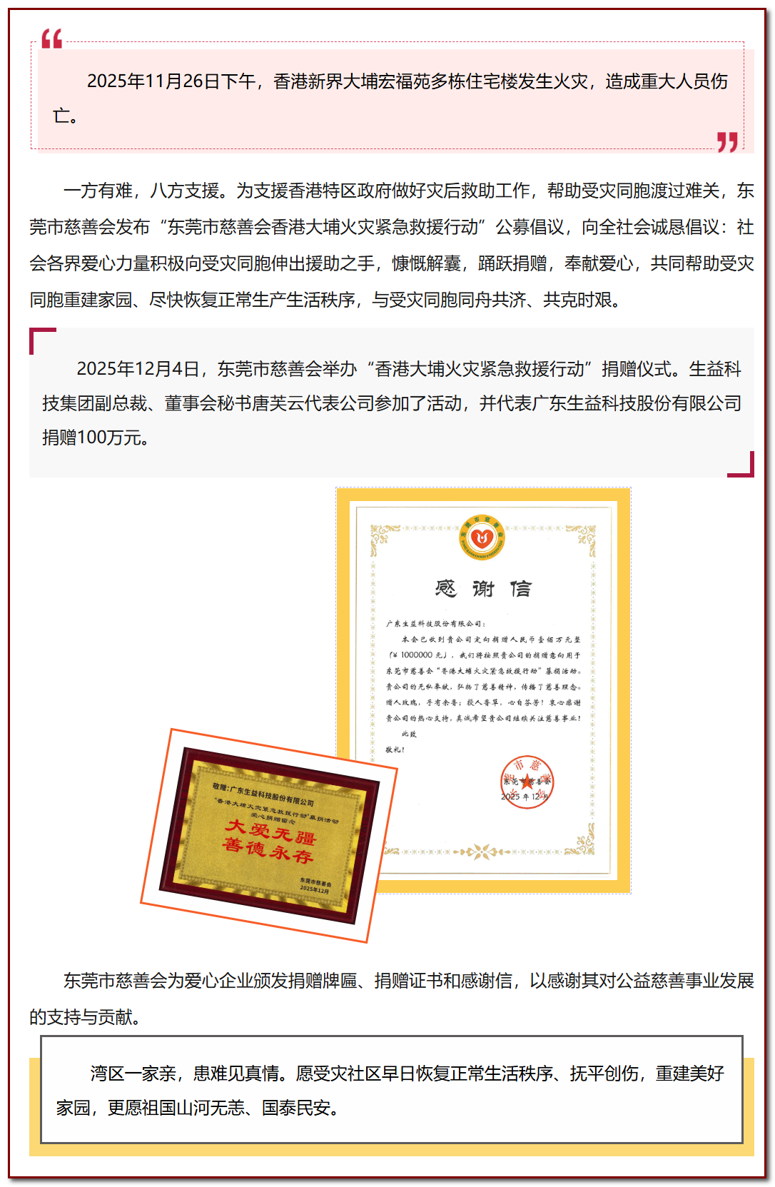 一方有难,八方支援——广东生益科技爱心捐款驰援香港火灾救援