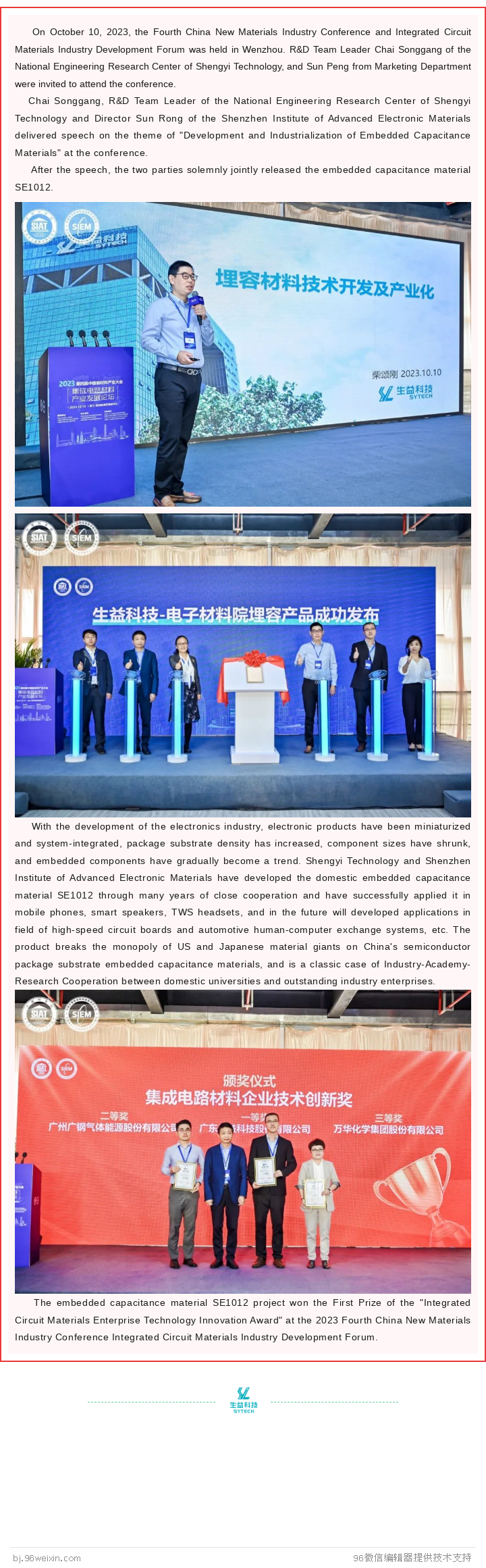 SHENGYI TECHNOLOGY RELEASED EMBEDDED CAPACITANCE PRODUCTS AND WON THE FIRST PRIZE OF THE INTEGRATED CIRCUIT MATERIALS ENTERPRISE TECHNOLOGY INNOVATION AWARD